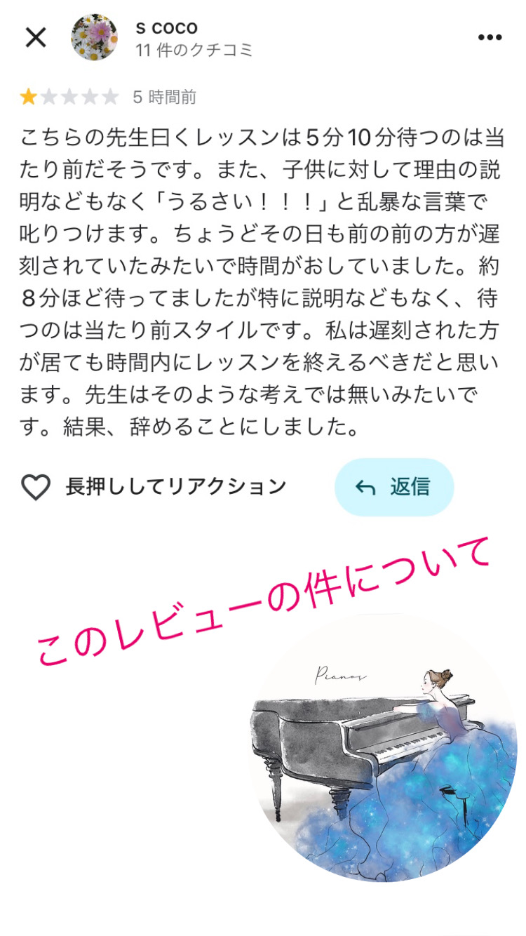 今回、当ピアノ教室に関して厳しい評価がGoogleレビュー上に掲載されましたので、教室側からの意見として、保護者様にお伝えしたくホームページ上に掲載させていただきます。