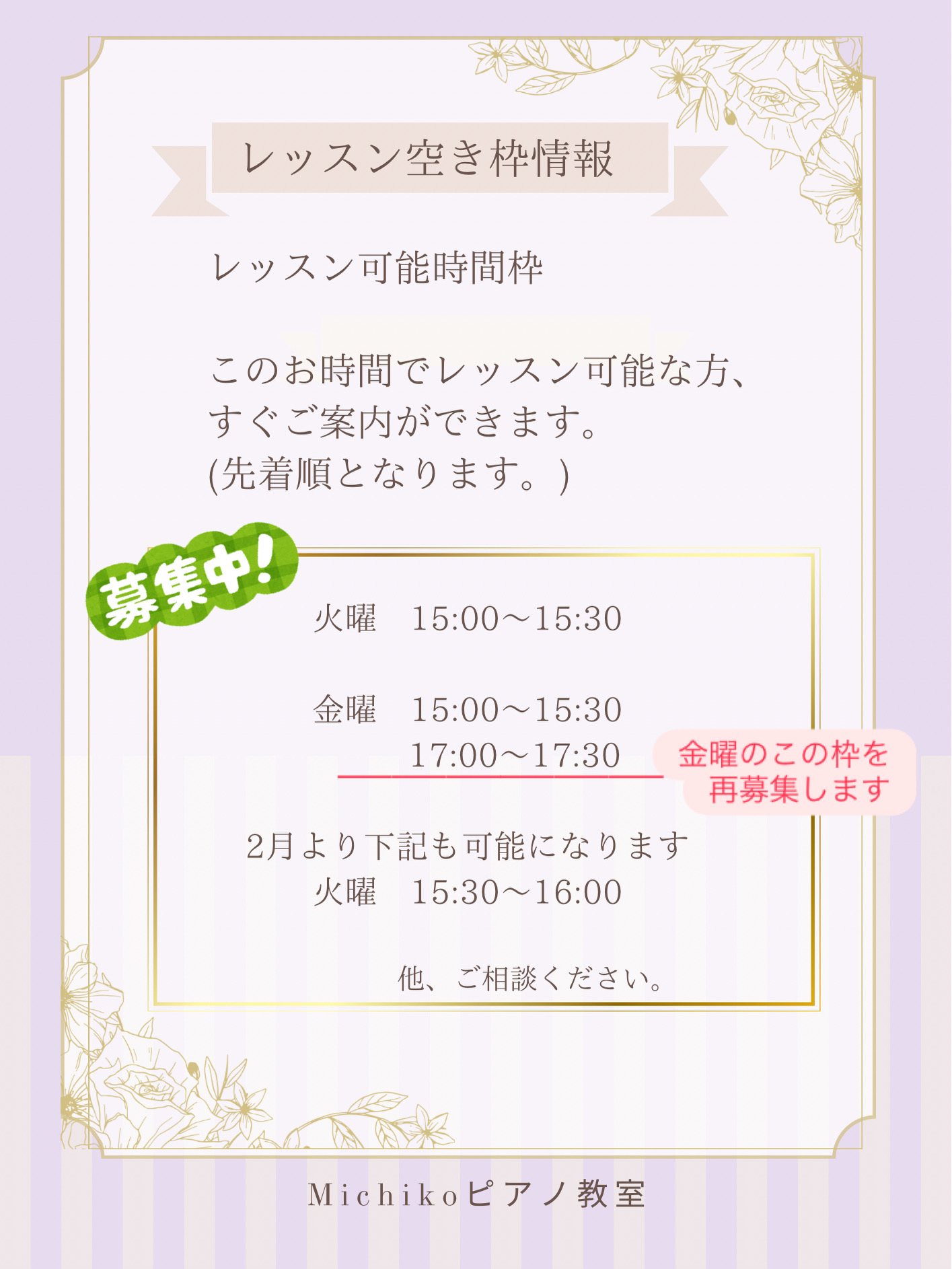 Michiko ピアノ教室へのお問い合わせ・体験授業のお申し込みはお電話、またはメールにて受け付けております。